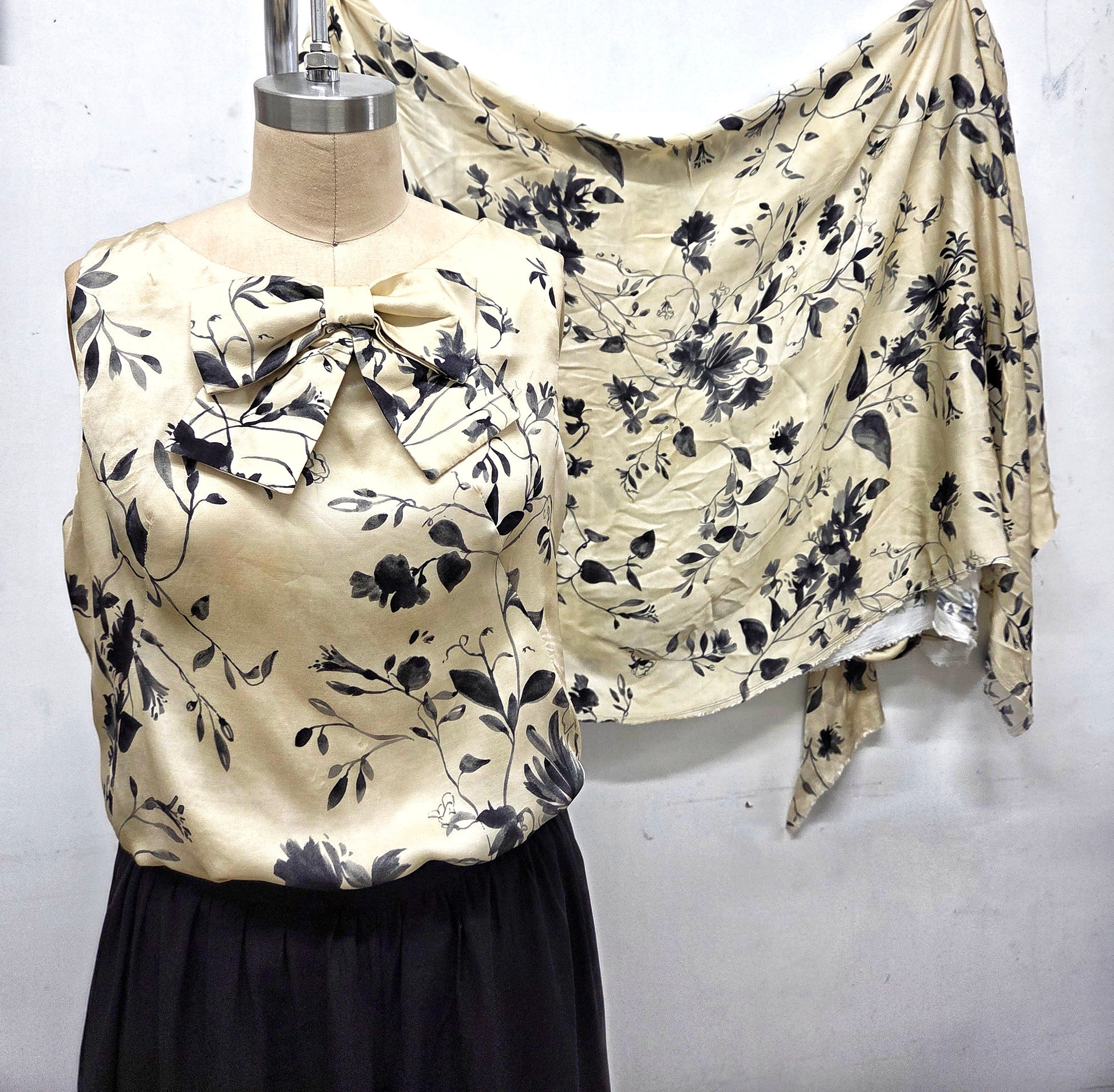 Introducing our refined, very dressy bow top! This fabric was bought at a boutique fabric shop in Southern France. Frequented by designers for private customers. I bought what I could spend and still enjoy vacation. I will return with a larger budget. Beautiful fabrics!