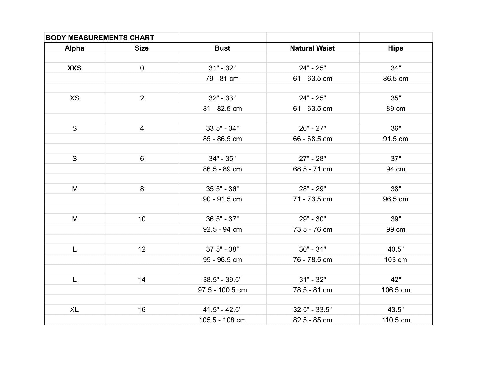 SEE BODY MEASUREMENTS CHART ATTACHED IN PHOTOS, IN INCHES AND CENTIMETERS.
